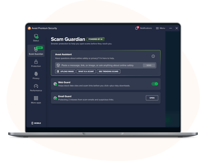 استمتع بالحماية الحائزة على جوائز من عمليات الخداع والتهديدات السيبرانية، وبتجربة تصفح أكثر أمانًا على شبكات Wi-Fi العامة. تحقّق من الرسائل أو العروض المشبوهة باستخدام Avast Assistant الجديد والمدعوم بالذكاء الاصطناعي. يمكنك حظر محاولات التتبُّع عبر الإنترنت وتسريع أجهزتك.